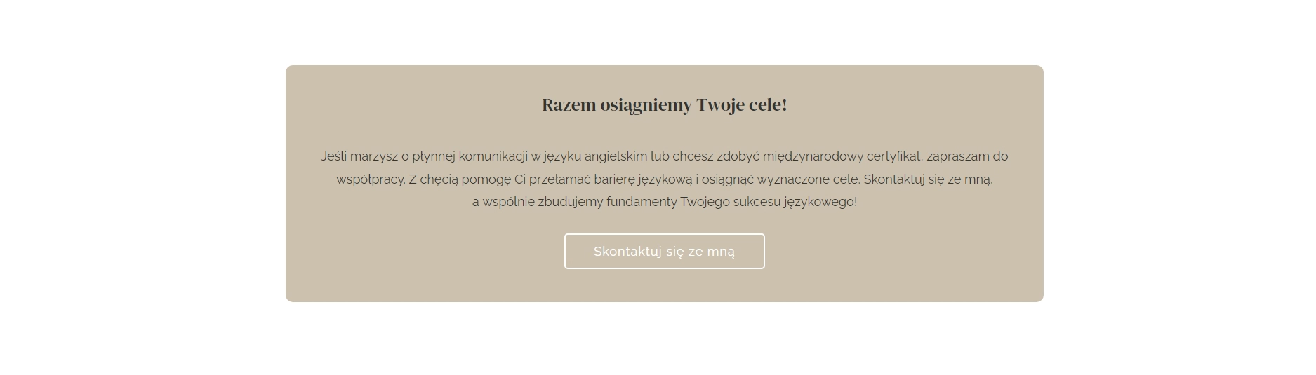 Klientce zależało na tym, aby strona internetowa była bardzo minimalistyczna. Po kilku wspólnych sesjach konsultacyjnych udało nam się znaleźć odpowiadający wizji klientki wygląd. Jest to na ten moment prosta strona internetowa, prezentująca ofertę językową. Dodatkowo na prośbę klientki przygotowałem stronę tak, aby w przyszłości można było wdrożyć sklep internetowy.